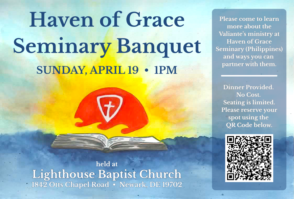 Graduation is coming, and we are looking to expand our base of support. If you are in the local area, we will be hosting a Banquet for Haven of Grace Seminary on Sunday, April 19 at Lighthouse Baptist Church (Newark, DE). Check out the update for all the details.